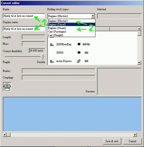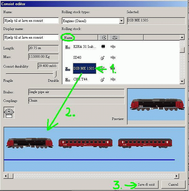 Derefter vælger du hvilken type du vil sætte ind, det gør du under, Rolling stock types (2), som på billedet ovenover. Når du har valgt typen, finder du toget under, Name (1). For at sætte det ind i din consist, holder du højre museknap inde, og trækker toget ned I det lyseblå felt (2). Som på billedet nedenunder. Så vælger du igen type, tog og trækker det ned, vær opmærksom på at du ikke kan fjerne et tog fra det lyseblå felt, så hvis du laver en fejl skal du begynde forfra. Når dit consist er som du vil ha det trykker du, Save & exit (3), derefter Cancel til, Place consist boksen og kryds for at lukke editoren. Nu har du lavet dit første consist, som du finder i MSTS, under det forreste lokomotiv. |