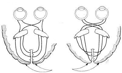 Voor de geboorte, tijdens de embryonale ontwikkeling, ontstaat de afwijkende bedrading van de oogzenuwen. Waarschijnlijk speelt het pigment epitheel bij het verloop van de zenuwbanen een rol. Bij een albino wordt er geen signaal aan de zenuwvezels gegeven om van richting te veranderen, dit komt door de stoornis in de pigmentcellen. Daarom heeft een albino altijd (meer) gekruiste oogzenuwbanen, hierdoor kunnen de ogen coordinatieproblemen hebben.