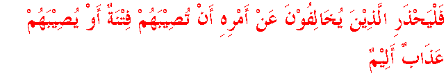 “Maka hendaklah orang-orang yang menyalahi perintahnya (rasul) takut akan ditimpa cobaan atau ditimpa azab yang pedih (dari Allah).”