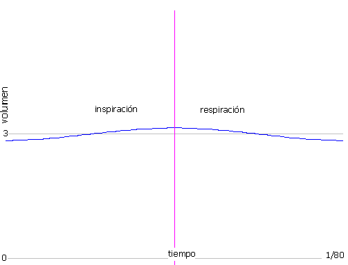 La gráfica es un trazo típico de la información arrojada por espirograma. Un espirograma es una gráfica producida por un aparato conocido como espirómetro, estos aparatos se utilizan para medir los volúmenes pulmonares. El trazo se ajusta a la función V(t)= 3 + .05sen(160p t-p /2). En donde t es el tiempo medido en minutos y V(t) es el volumen de los pulmones en litros.