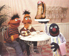 Look what we got here! Bert and Ernie sitting in a restaurant. But what is that??? Oops! Bert? strange fantasies?