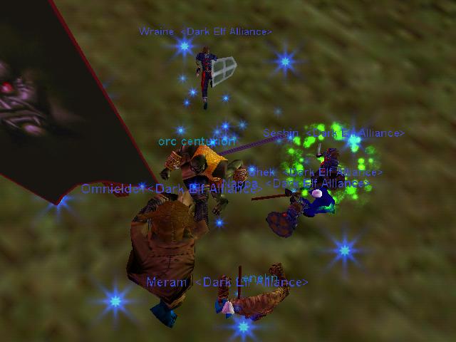 Here the Dark Elf Alliance has an intimate and rewarding encounter with a brave, yet dying, Centurion. Notice the position of Wraine the Rogue, his blade will soon be sliding into the creatures kidney's. Omnicide, Nappa, Shek, and Seshin round out this well balanced team of Spellslingers and Steel Slashers. Note my Earth Elemental. They serve willingly and die for me when commanded. |