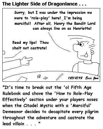 ComixOne of the good things about the Dragonlance Saga is its capacity for humor. The existence of kender proves that beyond a doubt. Therefore, I decided, after looking at the Comix section of DRAGON magazine and reading Knights of the Dinner Table, I decided to draw up a cartoon of my own. Should anyone want to submit a cartoon or two to this page, then go ahead. As for the rest of you, enjoy! | Dragonlance Funnies![]() |
