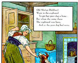 La anciana 'Ña Hobardo con su pobre perro, a buscar un hueso se fue a la despensa Pero alli se encontró la despensa desierta y su pobre perrito sin nada se quedó. |