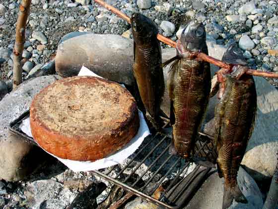 Wer sich auf's Brot backen versteht und fischt, kann auch in der Wildnis hervorragende Mahlzeiten zubereiten. Frische heiss geraeucherte Aeschen und deftiges Graubrot: