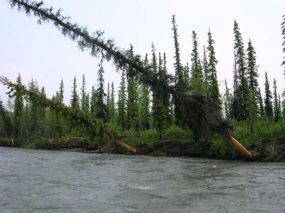 Als das Eis auf dem Sheenjek River in 2004 brach, waren die Wurzeln der beiden Baeume noch fest im gefrohrenen Boden verankert. Von der Stroemung mitgetragene Eisschollen haben bei ihrem Aufprall auf diese Hindernisse die Rinde von den fast voellig aus der Boeschung gewaschenen Tannen geschaehlt.
