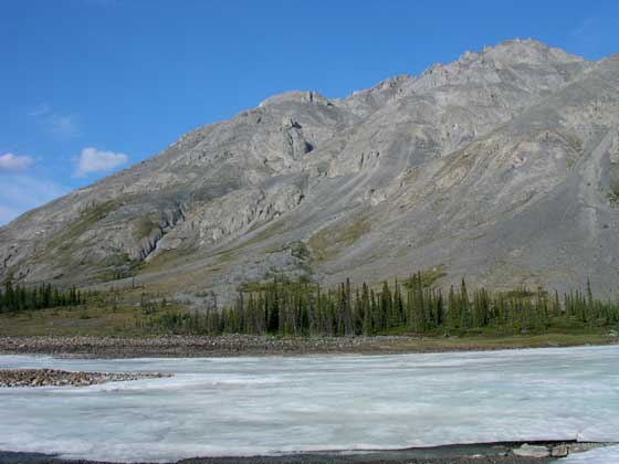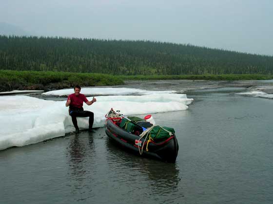 Obwohl die beiden Brueder ihre Tour am 10. Juli gegannen, zeigt dieses Bild, dass der arktische Winter den Oberlauf des Sheenjek niemals ganz aus seinem Griff entlaesst.