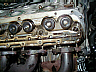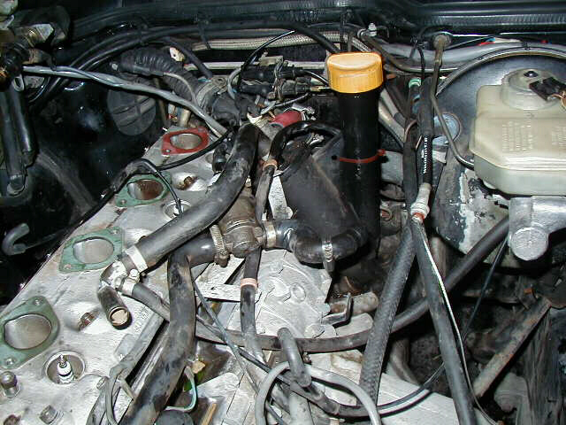 Aside from the head gasket failure, there were several other problems to address. Since I was tearing in this far, I might as well take the time to replace all the ventilation lines and vacuum hoses. I managed to find all the correct bends I needed from a local shop, with the exception of one "S" bend multi-diameter hose that I needed to order from Zims. I saved myself a bundle using shelf hoses and fortunately, the shop didn't mind me looking around in the inventory for similar sizes and shapes. I rebuilt this motor "on the street" in the town where I live! I didn't plan it this way, in fact I even had a garage accessible, but when I went to start the car to move it, I found the clutch pedal traveling to the floor and sticking there! WHAT NOW? Well it seems as if the clutch slave cylinder decided to quit at the same time... not only that, the brake master cylinder actually developed a leak THROUGH the ATE aluminum cast housing! so, off they came. It did give me the chance to repaint the brake booster and check it for damage. I also decided while I was waiting for the head to come back from the shop that I would replace ALL of the coolant lines, brake pads, stainless steel brake lines and bleed both the clutch and brake system (refilled with Super Blue Racing fluid). Incidentally, no matter how long you leave the oil pan and coolant drain, you'll have a mess when you dislodge the head! First string of images shows it all too well. Also note the oil/coolant mix had been sucked all the way up through the recirculation hoses and actually been re-injected into the cylinders! Total cleaning was very necessary here. The head required only new valve guides and seals as far as parts go. Surprisingly the valves were in very good shape for having 122,000 miles on them. The guides were well out of range and probably added to the rattling within the head. The head was resurfaced, pressure tested, re-valved, cleaned and torqued. I know I've gained a few HP from the job as the milling of the head removed enough to decrease the total volume in the cylinder. I didn't use the thicker head gasket for this job or a WFR gasket, neither was necessary here.