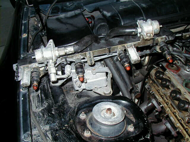 Know what this is? Well it's a valve seal. Know where I found it? BEHIND THE THERMOSTAT! Yep, that's right, lodged in the pump housing behind the thermostat! I didn't know at first what it was until I saw the rebuild kit for the head, which included new valve seals. How this got in the cooling system is a complete mystery. I do know that this car bent valves once before so maybe it was dropped in the cylinder jacket accidentally. At any rate, it was crushed and lodged in the water pump. Lesson learned: 4 dollar part and lack of caution causes 2 grand in damages! Back to work on the rebuild, I replaced the water pump, this time without the valve seal ;^) and installed the new thermostat and thermofan switch. I also decided to reverse flush the heater core and the radiator to make sure there were no other obstructions. Noting found, thankfully. Another issue was the fuel injectors. When I removed the rail I saw that several had cracked tips, so I opted to rebuild them all.
