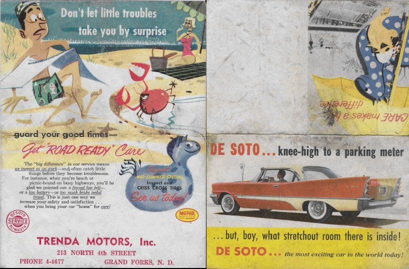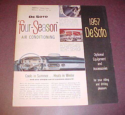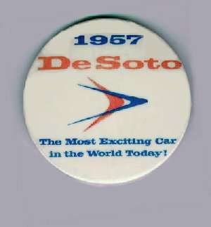 Click on pics for a larger image! Salesman's shirt pin/button Ad for custom coaches like hearses! Where tomorrow begins...DeSoto for 1957 Step Ahead ad 1957 DeSoto sweeps the years aside! These great advances...! Ad for Gulf Oil Co. featuring 1957 DeSoto Ad bragging about the success of DeSoto! Burnett Motors ad Styling that helps you steer! Air Conditioning brochure DeSoto gives you a Sales Punch! A nice quad-fold ad promoting maintenance!