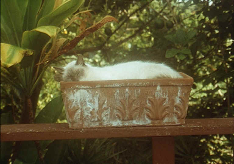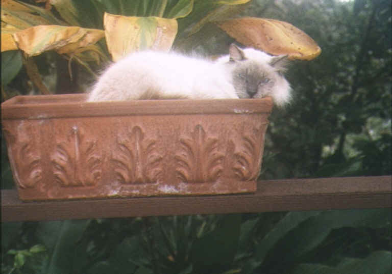 Morgan, flower pot sitter. . In his Favorite pose . . Hinahina, the Water Cat. . Never before have I seen a cat who LOVES water as much as Hina. . She jumps in the bathtub, shower or sink at a moment's notice. . . . . . . . Morgan Again, . this time giving us "Stink-eye" for being disturbed from his nap. .