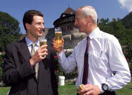 National Day in Liechtenstein: Hereditary Prince Alois and his father Prince Hans Adam II. enjoying a beer