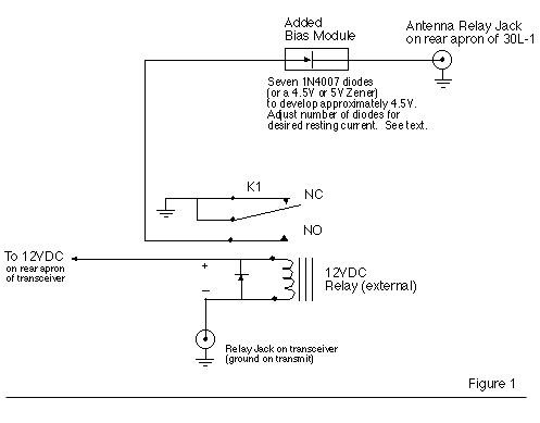 Most modern solid-state transceivers are capable of keying 12 Vdc at 1 ampere. The 30L-1 requires a sub-system capable of operating the T/R line at the negative 170-volt line (at about 75mA). It therefore requires an interposing relay, keyed by the transceiver T/R line. The contacts of the interposing relay then key the (-) 170-volt line of the antenna relay on the Collins. This is shown in one of the schematic diagrams (see fig. 3) as designed for interfacing with the Icom 751A. Other transceivers are similar. Current power amplifiers utilize antenna relay voltages which vary from 12 Vdc to 115 Vac. Make sure that their needs are met.