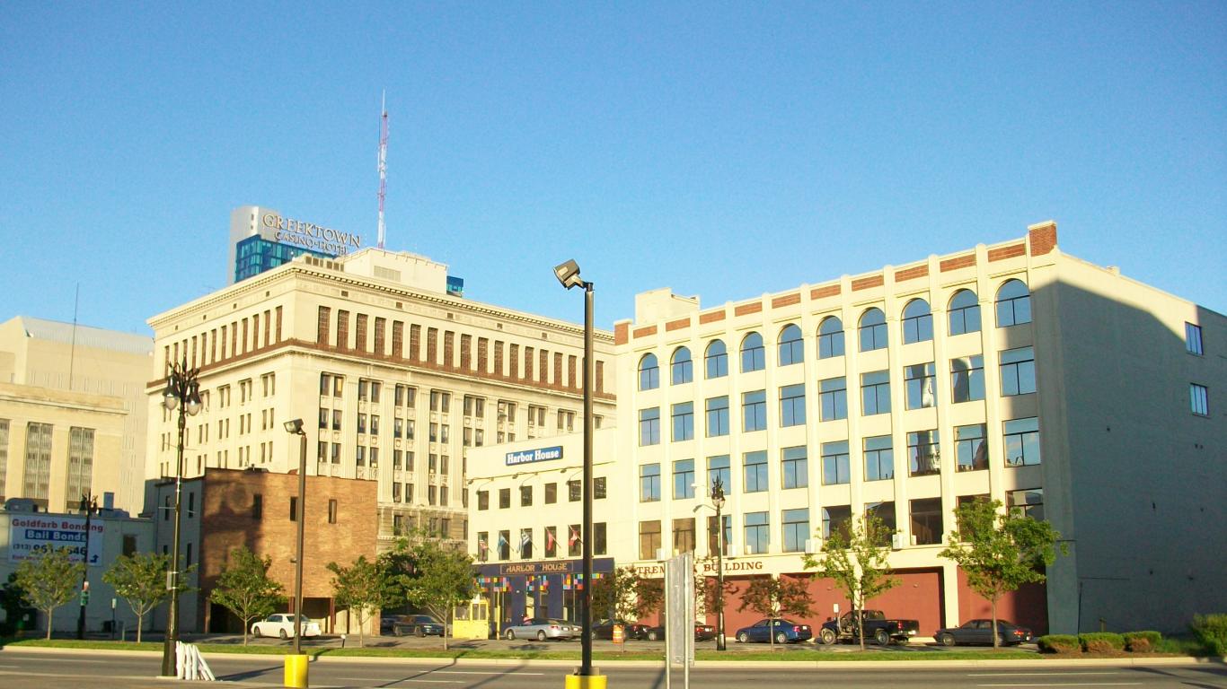 The corner of Beaubien and Clinton. The jail, Police HQ, Greektown Casino, Harbor House and Tremonti Building can be seen.