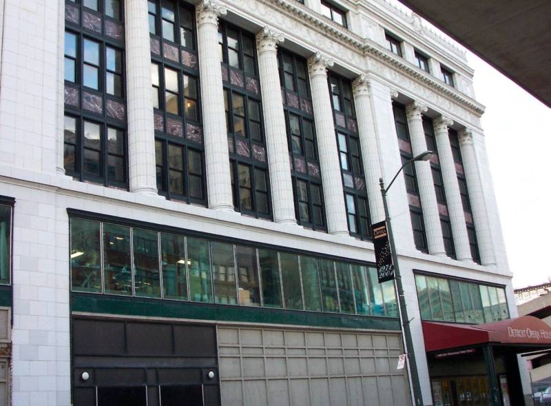 The ornate side of the Detroit Opera House. A portion of the People Mover tramway can be seen.