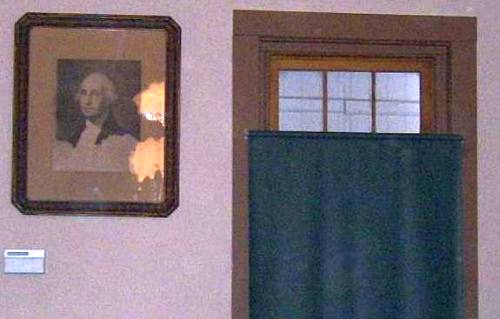 Under this old portrait of George Washington is a burglar alarm panel.