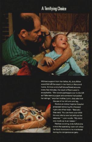 Without support from her father, Al, Jody Miller would fall off the couch in her family´s Maryland home. At three and a half she suffered seizures every few minutes, the result of Rasmussen´s encephalitis. "She would just topple over to the left as she were a puppet and someone had pulled her strings", says her mother, Lynn. Jody also lost the use of her left arm and leg. Doctors at Johns Hopkins Hospital proposed removing the diseased right side of her brain . "basically they said, 'You can have your child the way she is now but without the seizures,' " Lynn recalls. "My mind was made up in an instant." Patches covering Jody before she enters the operating room will allow her body functions to be monitored during the dangerous surgery.