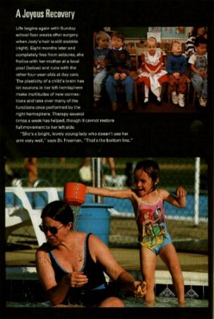 A Joyous Recovery Life begins again with Sunday school four weeks after surgery when Jody's hair is still stubble. Eight months later and completely free from seizures, she frolics with her mother at a local pool and runs with the other four-year-olds at day care. The plasticity of a child's brain has let neurons in her left hemisphere make multitude of new connections and take over many of the functions once performed by the right hemisphere. Theraphy several times a week has helped, though it cannot restore the full movement to her left side. "She's a bright, lovely young lady who doesn't use her arm very well", says Dr. Freeman. "That's the bottom line".