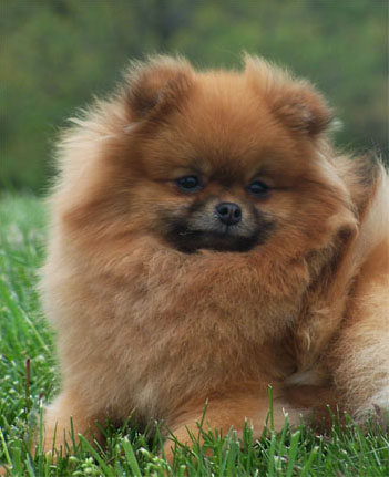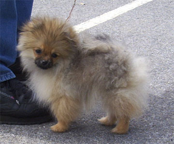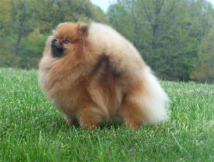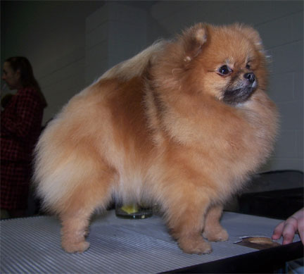 Jolson was co-bred with Lisa Pauls, CandleBrite poms, and is a daughter of our CC. Her father is Am/Can Ch. Chriscendo Call To Arms, who is a son of our Dream. At 6mos she is losing most of her sabling so she may go orange! She is looking really nice so far. She is pictured above at 14mos old.