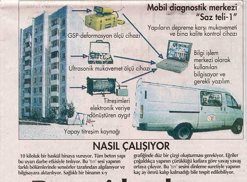 Rusya'da kullanılan bir sistemle, binaların deprem karşısında gösterecekleri davranışın belirlenebildiğini anlatan bir haber yayınlandı Hürriyet Gaztesi'nin Istanbul ekinde (7.9.1999). Habere göre, bu sistem, hem yeni bir binanın standartlara uygunyapılıp yapılmadığını, hem de deprem geçirmiş bir binanın gelecek depremlere daya