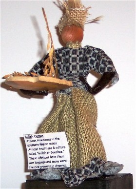 Gullah Ouman (Woman) - her story card reads: African Americans in the Southern region retain African traditions and culture called "Gullah" or "Geechee." These Africans have their own language and many were the rice growers in America.