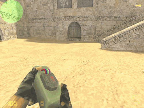 This is the bomb the Terrorists use on bomb/defuse maps. It is not really an item, but I decided to put it here anyway. Every round, a randomly determined Terrorist starts with this bomb. They can either try to plant it in the bomb zone, or give it to one of your team mates. It gets it's own weapon category, number 5, (1 is primary weapon, 2 is pistol, 3 is knife, 4 is grenades.) You know you have the bomb because you will see a little bomb symbol on the middle left of the screen, (in the same place where the defuse kit symbol would be.) You will know you are in the bomb zone because you will see this symbol flash red, as shown in the animation to the left.