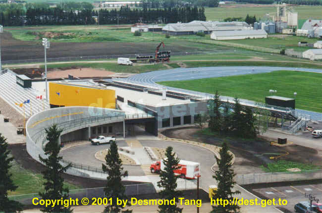July 2001The original wire fence adjacent to the trees was removed and the lower branches of each tree were pruned and mulched. The undergrowth was removed and fresh soil was added so it looks quite tidy now. [ photo 40 - 49 kb ] Stone/concrete benches added a finishing touch to the driveway circle. Track lanes are completed painted while the field lines (for javelin, shot put) are pending. A square pit about 2 feet deep at the south end of the west field appears to be for steeplechase as the subsequent placement of a hurdle indicates. I had no idea the water jump was that deep! [ photo 41 - 62 kb ] Three girders erected at the south end of each field were held in place with some wooden supports for a few days. Then the scoreboards were installed. Curiously, a few days later, the scoreboards were taken down and put up again. [ photo 42 - 42 kb ] Speakers for a public address system are installed on the roof of the west field shelter as well as on the two light poles adjacent to the bleachers. The 35 white rolls that were south of the bleachers contain the artificial turf as suspected. A grid has been painted on the asphalt of the east field to aid in placement of each strip of turf. [ photo 43 - 40 kb ] This appears to be a major challenge as there are about eight people working on it (laying it out, lining it up, sticking it down, rolling it flat) and it's done at a rate of about 1 or 2 strips a day (if it hasn't rained). After laying 2 to 3 green strips, a number of yellow pieces were placed on the asphalt that roughly mark out the goal areas and midfield. [ photo 44 - 39 kb ] It appears the green strips are placed on top of the yellow pieces. The roadway from 116 Street to Foote Field has been re-paved. A guard monitors access to the field. Horizontal banners with the World's logo have been attached to the chain link fence on either side of the gate. A TICKETS sign adorns the building above the four windows. Mats for pole-vault and high jump were placed and the support poles put up a few days later. The safety netting for the discus and hammer throw is also up; it is set up farther west of the field. [ photo 45 - 50 kb ] Parking curbs line the edge north of the west field and some vehicles are parked on the sand. In spite of this, a grader, a roller and a vibrating compactor came along later in the day to presumably prepare this area for paving. Sod was laid next to the driveway entrance. During the week of the 23rd, bus stop signs were visible and buses began transporting athletes to the facility for practice sessions. There are now two security guards at the main gate; a small hut was built to shelter them from the wind and rain. Three large vertical banners atop tall poles adorn each side of the main gate. [ photo 46 - 29 kb ] Mid-morning and mid-afternoon are the busiest practice times. There have been javelin and hammer throwers, hurdlers, sprinters including relays, high jump and pole-vault, race walkers and even amputee runners. [ photo 47 - 52 kb ] In the tents, the athletes can get refreshments or massage therapy. |