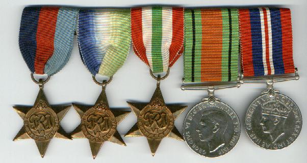 Set of medals from WWII: L to R, 1939 Star, Atlantic Star, Italy Star, Defence medal, War medal
