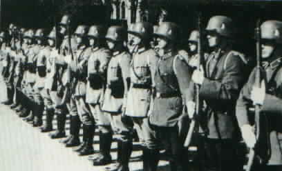 Once renamed Ladespolizeigruppe Wecke z.b.V., the blue uniforms of the police unit were replaced by green ones, cut similar to army uniforms. The changing of the guard is wearing these new uniforms for the first time.