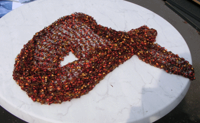 Er ist aus Scala gestrickt, 28 Maschen im Fallmaschenmuster. Gebraucht habe ich 2 Knauel und wenn ich jemals nochmal die Nerven dazu habe mir selbst einen zu machen wird er schmaler und langer ;)