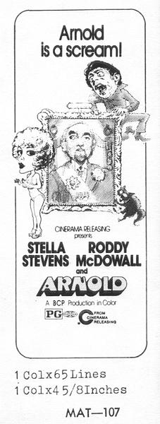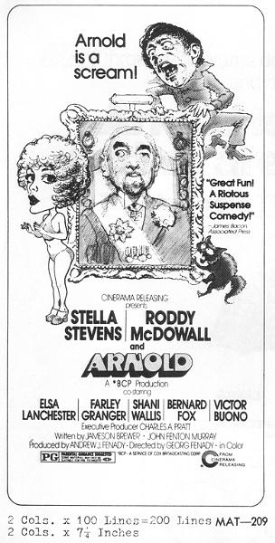 RODDY McDOWALL: FINDING A NEW MOVIE IMAGE IN "ARNOLD" Nostalgists, who tend to think of Roddy McDowall as the wistful boy who was kind to horses and dogs in films like "My Friend Flicka" and "Lassie Come Home," and more comtemporary audiences identifying him mainly with his roles as a chimp in the popular "Planet Of The Apes" series will be in for a surprise when they see the veteran star as a charming but caddish playboy in his latest motion picture ARNOLD, the screamingly funny mystery comedy opening at the Theatre. In ARNOLD, Roddy portrays a scoundrel who likes fine wines and expensive clothes and who will stop at nothing - but nothing - to win the love and, not so incidentally, the fortunes of sultry Stella Stevens. The characterization offers him the first opportunity to be a romantic leading man with strictly dishonorable intentions, and Roddy relishes the challenge to his image. "I played so many appealing, heartwarming types for so long, I started to think I was really like that and roles like this help me to keep my sanity," he explains. "That's why I jumped at the chance to play in all those 'Ape' films," says Roddy. "You couldn't tell if I was my usual wistful self under all that simian makeup." Co-starring with Roddy and Stella Stevens in ARNOLD are Elsa Lanchester, Farley Granger, Shani Wallis, Victor Buono, John McGiver, Bernard Fox and Patric Knowles. The Andrew J. Fenady production was directed by Georg Fenady from a screenplay by Jameson Brewer and John Fenton Murray. A BCP presentation, a service of Cox Broadcasting Corp., it is distributed by Cinerama Releasing. |