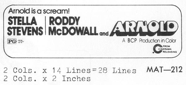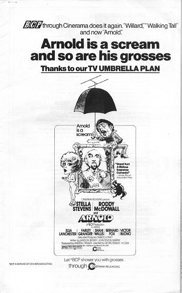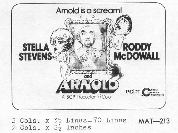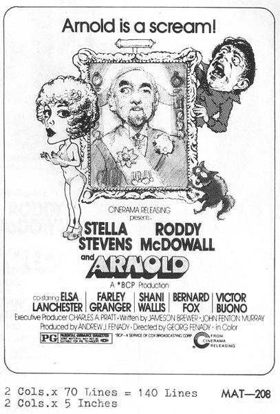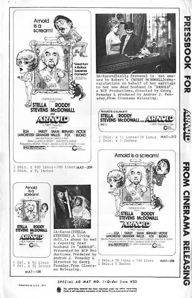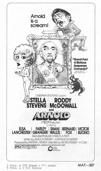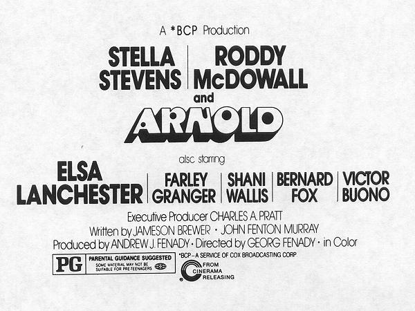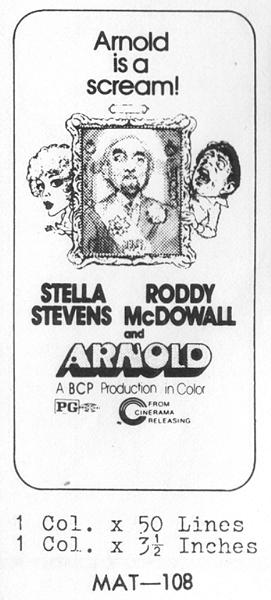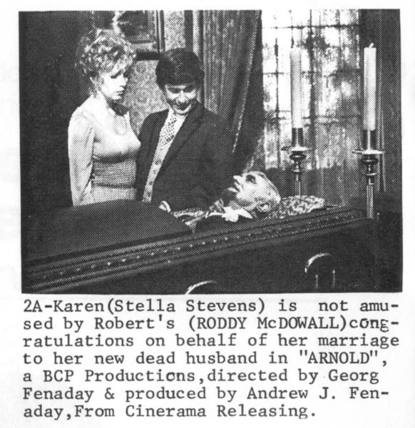 PRODUCTION NOTES One of the year's brightest casts joins in spirited force for BCP Production's ARNOLD, the mystery comedy that follows a loving couple from their wedding in a cemetary crypt - where Arnold, the late groom, is in repose - and on to a very deadly honeymoon in which the bride begins to realize that the dead man she married is, positively, the living end. Sultry Stella Stevens, in her first motion picture appearance since achieving broad critical and audience acclaim for her performance as the wise-cracking trollop in "The Poseidon Adventure," plays the loving and much-loved bride in distress, while Roddy McDowall, Elsa lanchester, Shani Wallis, Farley Granger, Bernard Fox, John McGiver, Patric Knowles and Victor Buono, as the minister, are among those who, to varying degrees, offer solace and support. It's all in frightful good spirits as tailored to the talents of the all-star cast by Jameson Brewer, the fightmaster who recently penned BCP's "Terror In The Wax Museum," and gagman John Fenton Murray, a veteran writer for The Marx Bros., Danny Kaye, Jerry Lewis and Phyllis Diller. For Stella Stevens, her role as Karen Llewelyn in ARNOLD is certainly the most off-beat in a career that has been as varied as it has been distinguished. Starting off as a decorative sex symbol in movies like "Say One For Me" and "Lil Abner," she soon graduated to comedy roles in "The Courtship of Eddie's Father" and "The Nutty Professor" with Jerry Lewis. Stardom quickly followed with dramatic roles in John Cassavetes' "Too Late Blues," "Synanon" and "Rage," while she was able to combine her flair for both comedy and drama in Sam Peckinpah's "The Ballad Of Cable Hogue" and the phenomenally popular "The Poseidon Adventure." Co-starring with sexy Stella, as he did in "The Poseidon Adventure." is Roddy McDowall who in that film had to admire the heroine from afar as the ill-fated busboy who helps lead survivors of a sunken ship to safety. In ARNOLD, however, Roddy gets closer to Stella - in fact, he becomes her lover in the role of a caddish playboy who seems interested in her inheritance as in her love. It's a distinct change of image for Roddy who began his career as a child actor in films like "How Green Was My Valley" and "Lassie Come Home" and has more recently been involved in character roles. Equally at home in horror or comedy, but at her best when able to combine her talents for both genres, is the inimitable Elsa Lanchester who plays Hester, Arnold's eccentric sister. A veteran of more than 60 motion picture roles, Elsa has earned cinematic immortality with her portrayals in two classic horror films, "The Bride of Frankenstein" (in which she played the title role) and BCP's "Willard," and with her comedy playing in Walt Disney's "Mary Poppins." Farley Granger, who starred for Alfred