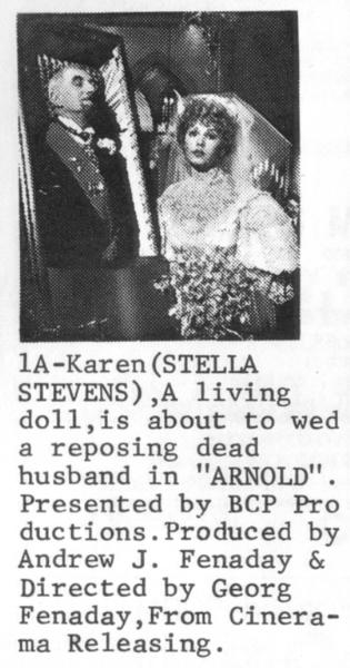 long hiatus on stage ("The King And I") and -2- in Italian films, most notably Visconti's "Senso," while Victor Buono continues in the horror tradition that began with his screen debut in "Whatever Happen To Baby Jane?" Shani Wallis, the electrifying motion picture discovery of "Oliver" and the talented screamer in "Terror In The Wax Museum," gets the opportunity to sing the title song in ARNOLD, composed by George ("Picnic") Duning and producer Andrew J. Fenady, and also to scream most effectively in her role as Jocelyn, the late Arnold's ex-wife. ARNOLD was produced by Andrew J. Fenady at the Paramount studios in Hollywood and directed by Georg Fenady. Charles A. Pratt served as executive producer for BCP Productions, a division of Cox Broadcasting Corporation. It is distributed by Cinerama Releasing. STELLA STEVENS -- SEX SYMBOL WITH TALENT For a gal who regards herself professionally as "primarily a sex symbol," the indisputably stunning Stella Stevens has had a remarkably diverse career. She has played unglamorous dope addicts and psychopaths, alluring femme fatales, empty-headed gold diggers and, once, even a nun to critical and public acclaim, but her role in BCP Productions' ARNOLD, a mystery comedy, is the strangest - and perhaps most challenging - of her career. Sultry Stella is knocking 'em dead with laughter in ARNOLD as Karen Llewelyn, the lethal young lady who weds in a cemetary and honeymoons with a corpse while keeping intermittently alive her relations with a steady procession of lovers. Stella regards the comic part of the deceased Arnold's active bride as one of her favorites. "I really got into the spirit, if that's the word, and enjoyed myself immensely," she says. "It certainly beats posing in a bathing suit." Co-starring with Stella in ARNOLD is Roddy McDowall. The Andrew J. Fenady production was directed by Georg Fenady from a screenplay by Jameson Brewer and John Fenton Murray. Presented by BCP Productions, a service of Cox Broadcasting Corp., it is distributed by Cinerama Releasing. |