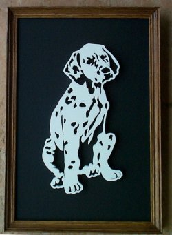 This is a nice picture for anyone with a love of dalmatian dogs. The dog is painted in matt white and mounted onto a matt black background and nicely framed in a light oak frame.