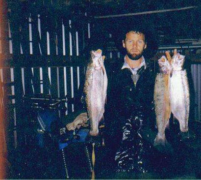 "The Man"Old mate Rodney with the gaff pretty pleased with himself.Notice the sea lice on the fish`s tail and dorsal line,these fish would enter fresh water to rid themselves of the parasites.