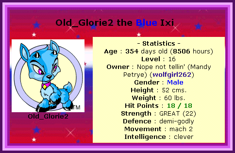 CONGRATULATIONS wolfgirl262! your pet, Old_Glorie2 the Blue Ixi is "PET OF THE WEEK"!