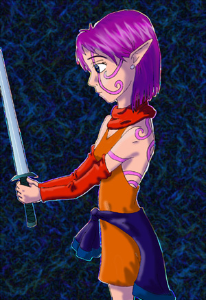 This is an elvish warrior from Shinji's world. She, as of yet, has no name. I just felt like drawing her. I've decided that the more magical you are, the more swirls there are on your skin. I made this using pen and Photoshop 5.0