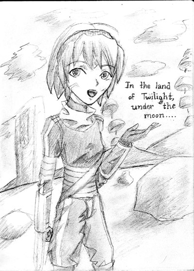 This is obviously a .hack//sign picture. It's a made up twin blade, who doesn't have a name yet (and I don't feel like naming her Light, like all my other fanart characters.) This is the second version of her. The first one, she had these gawd-awful pigtails... I'm not even going to discuss it. Anyways, I drew this right after watching the last episode of sign, and Sora of course was my inspiration. I HEART YOU SORA!! And any .hack fan would recognize that song... It's probably why you clicked on this picture, am I right?