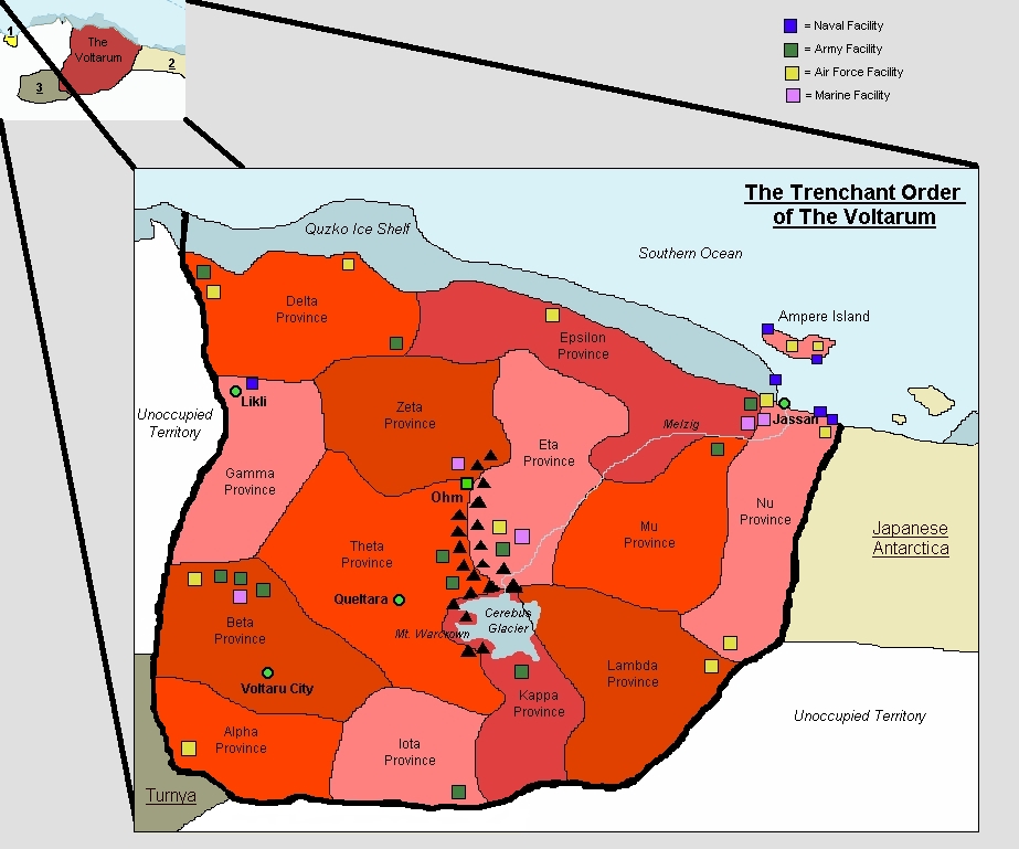 The interior of the Voltarum is mostly thick continental ice sheet, scattered with plateaus and rocky areas around major metropolitan areas. The coast around Jassan is ice free. As a result, most cities are entirely encased in protective ice domes, a specialty of Voltaru engineers. The mountain range in the middle of the country is massive and nearly impossible to go through, especially to those who do not know the terrain. The land is full of natural resources, including underground deposits of all major fossil fuels, a huge deposit of uranium ore which comprises a major manufacturing sector of the economy, along with most other precious and industrial metals. Fishing is also a huge natural resource, and is also a major food source. In addtion, there are numerous geothermal power sites throughout the nation, heating much of the Voltaru people. The land to the east belongs to Japanese Antarctica, a long time friend and ally.. The land to the west is under the protection of the Voltarum. A major railway connects The Voltarum with Japanese Antarctica, and also to the west to the North Sector Naval Base. Both ends of this line are under guard by Voltarum Special Forces. Turnya to the south has no relations with The Voltarum. The local time is GMT +2:00. As Antarctic conditions make time very flexible, many countries of the region try to maintain a common day/night time period.. The sun sets in April and rises again in August. It also remains up 24 hours a day from October to February. Listed are all acknowledged military installations. Other points of interest are listed below the map. |