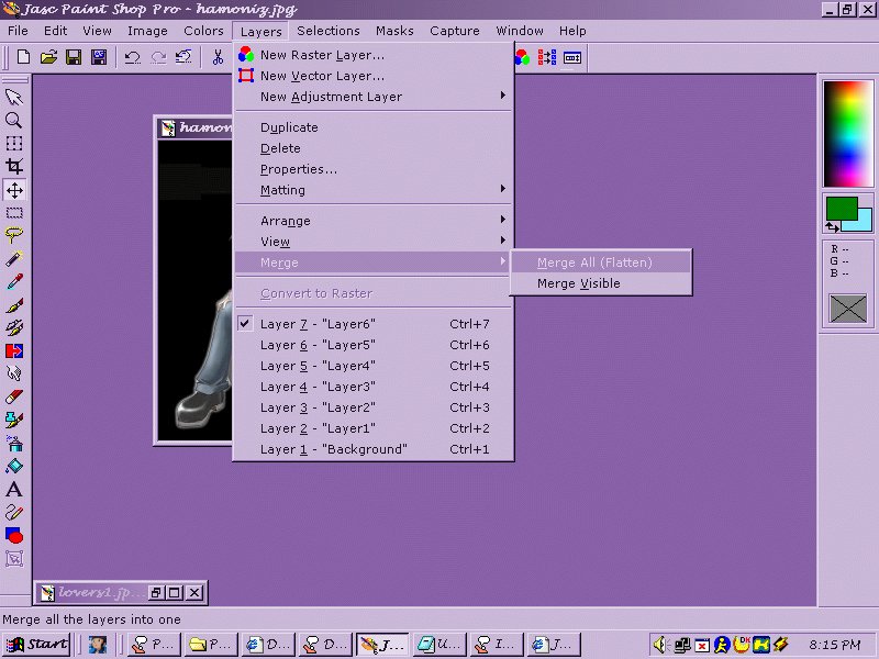 In this image, you've seen "Layer 6" on these steps. That was the topmost layer I did and was my last. As a hint, try to think in Layers... Suki's skirt is under the sweater/shirt. So... I recolored the skirt before I recolored the shirt.