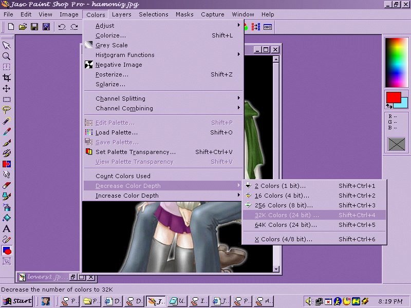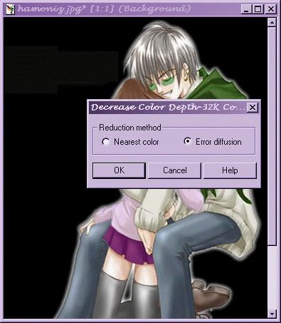 | Step Six | I know I showed you how to Increase the Color Depth... But here's how to Decrease. ^_^; This... just shrinks the file size of an image. We're taking this jpg from 64K to 32K Color (both are 24-Bit). Making this thing a gif would require you to Decrease to 256 colors. ^_^; And at the moment, that would probably look very.... bad. When you're asked, Choose Error Diffusion... (See below. ^_^;) |