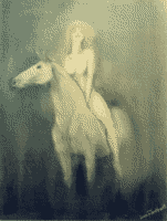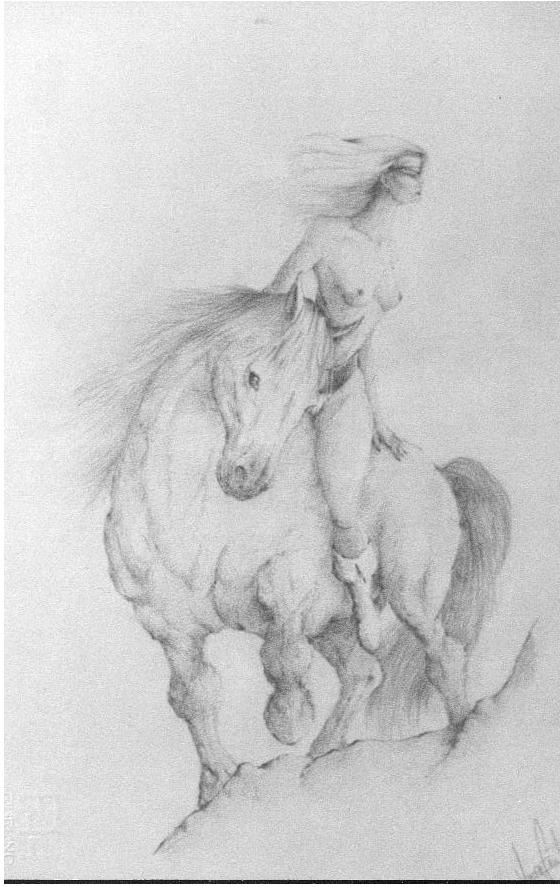 A lady on a white stallion, riding the hills - hard leaded pencil