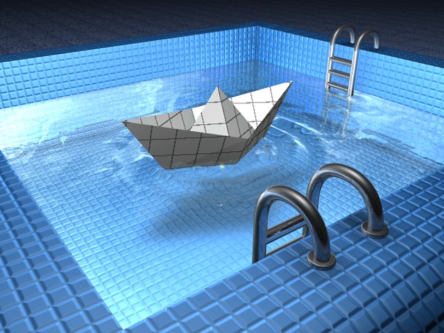 Water effects on this pretty weird scene (big boat in small pool) modeled and rendered in Cinema 4D XL