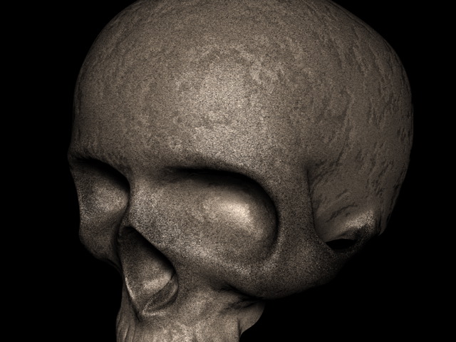 A Skull modeled in "node-to-node" polygon mode with Cinema 4D XL, and a "dirty nut" effect on
