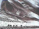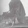 Upon arrival in the room with the coyote, Beuys began an orchestrated sequence of actions to be repeated over and over in the next three days. A triangle is struck three times to begin the sequence. This triangle that Beuys wears pendant around his neck is the alchemical sign for fire (dry, fiery, choleric warmth), which ancient glacial Eurasian shamans sorely needed. It is also a sign for the feminine element (earthy & mercurial) and for the creative intellect, and it is the Pythagorean symbol for wisdom. Striking its three sides three times, Beuys calls himself, Coyote, and the Audience to order. After the triangle is struck, a recording of loud turbine engine noise is played outside the enclosure, signifying "indetermined energy" and calling up a chaotic vitality. At this point, Beuys pulls on his gloves, reminiscent of the traditional bear-claw gloves worn by "master of animals" shamans such as those depicted on the walls of Trois Freres, and gets into his fur pelt/felt, wrapping it around himself so that he disappears into it with the flashlight. He then extends the crook of his staff out from the opening at the top of the felt wrap, as an energy conductor and receptor, antenna or lightning rod. The conical shape of the felt resembles a tipi, the nomadic shelter which migrated from Siberia to North America with the hunters. Topped with the crooked staff, it also recalls both the stag and the shape of the lightning The felt enclosure doubles as a sweat lodge for Beuys, accumulating the heat necessary for transformation.