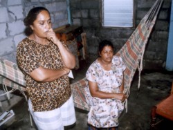 Gangadai Singh (left) sits in her hammock yesterday contemplating what she should do next after her husband was murdered. Next to her is one of her husband's sisters.