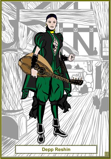 Depp Reshin: Depp is a bard who joined the party after the defeat of the Stonereaver and the Ascension of Jahalaira. Having heard of the party's exploits from her home in North Cambria she traveled to Highfork in the hopes of meeting them. INACTIVE: Depp returned to Highfork with Zelos.
