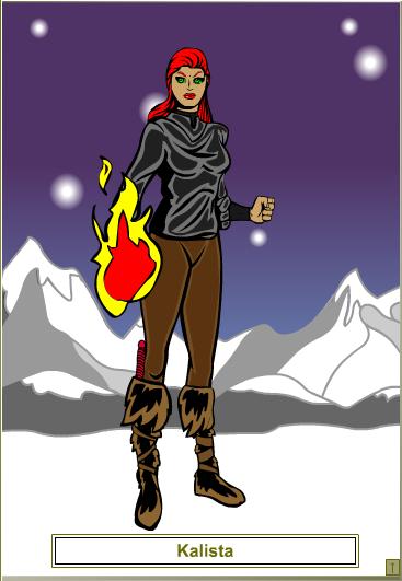 Kalista: Once the sole female party member, Kalista is Hank's ward. He found her an orphaned infant during his last quest far to the north, and has raised her as his daughter. Her innate magical powers have led her down the path of a sorceror, though she is working hard to master the way of the warrior. INACTIVE: Kalista remained in Highfork when the party departed for Chandreskahr to take ship to the east.