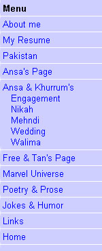 About meMy ResumePakistanAnsa's pageAnsa and Khurrum's EngagementAnsa and Khurrum's NikahAnsa and Khurrum's MehndiAnsa and Khurrum's WeddingAnsa and Khurrum's WalimaFariha' and Tan's pageMarvel UniversePoetry and ProseJokes & HumorLinksHome
