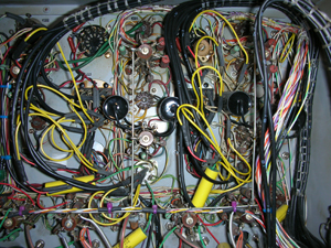 Recently Rein Narma and Les Paul were reintroduced at the 2007 TEC awards where he accepted an award for inventing this highly regarded compressor. The Fairchild 670 which originally sold for $1,500 is often referred to as the "Holy Grail" of outboard devices for its rarity value (currently about $32,000 on the used market) and usefulness in a wide variety of studio situations. This hand-wired stereo unit is a monster, with 20 vacuum tubes, 11 transformers, including 2 Inductors and another 2 transformers tucked within its 65-pound chassis. All of the wiring in this 1963 working model is hand wired. The unit was re-built, replacing the control i/p, control o/p transformers, capacitors in the power supply section and all of the interstage wiring connected to the matrix switch. The coupling capacitors at the gain reduction stage have also been replaced as have capacitors in the o/p stage including a tube socket.